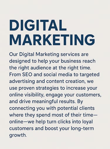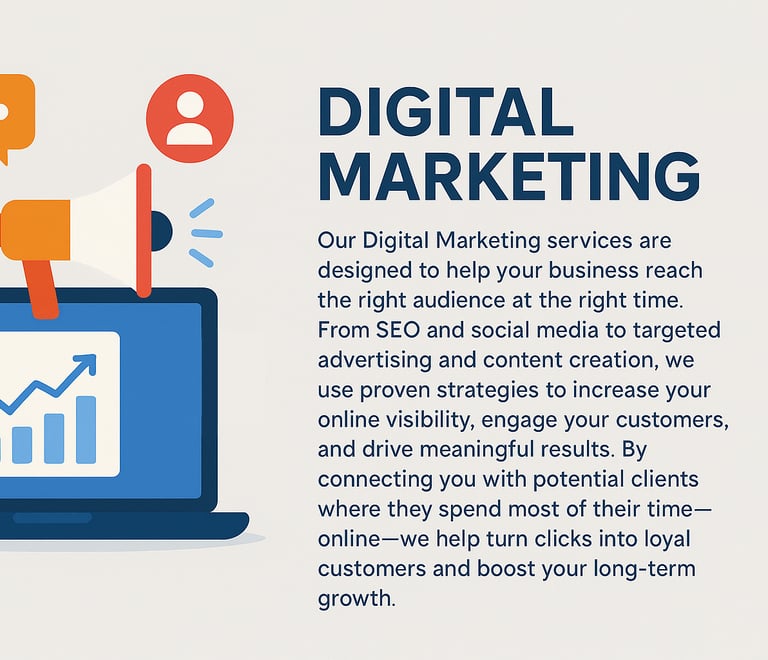 Our Digital Marketing services are designed to help your business reach the right audience at the right time. From SEO to Paid advertising, we use proven strategies to increase your online visibility, engage your customers, and drive meaningful results. By connecting you with potential clients where they spend most of their time—online.